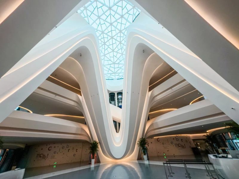 但“扎哈曲线”仍有它独特的美学价值,其营造的“圆环相套、无限延伸”的流动空间极富视觉表现力。大家可以透过玻璃幕墙感受随着时间流转的光影变幻,或通过旋转楼梯的几何线条中捕捉建筑的诗意,非常适合打卡拍照,这正是“网红经济”的吸睛点。此外,33米高的穹顶中庭也是一笔难得的艺术资源,这意味着它可以容纳体量庞大的作品。